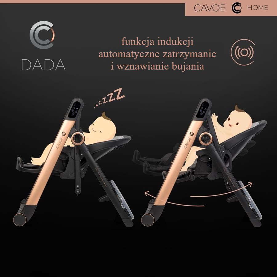 - Cavoe Dada nie jest zwyczajną huśtawkę elektryczną, inteligentna funkcja indukcji automatycznie wykrywa gdy Twoje dziecko zaśnie i automatycznie wstrzyma huśtanie, a gdy dziecko się obudzi i zacznie poruszać, huśtanie zostanie automatycznie wznowione