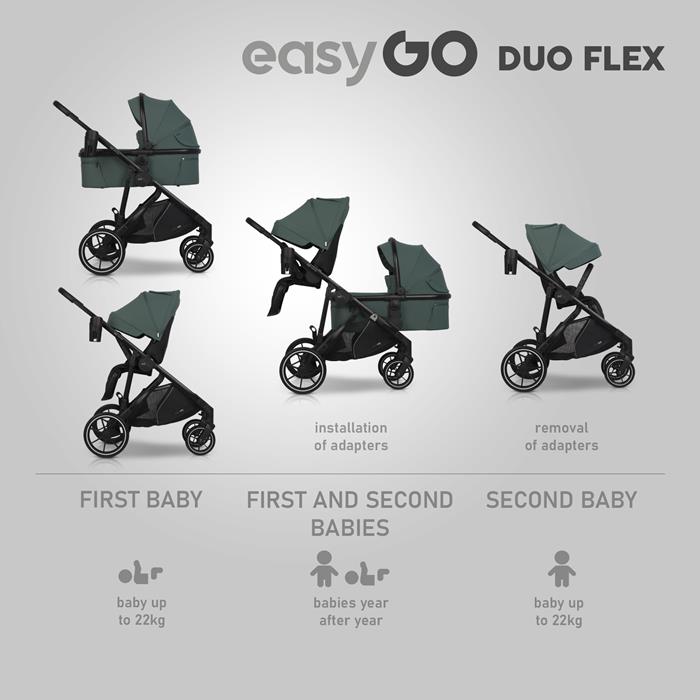Wózek EasyGo DuoFlex można stosować jako wózek dla jednego dziecka w wersji spacerowej lub 2w1 z jedną gondolą i jedną spacerówką, a gdy do rodziny dołączy drugie dziecko można go przekształcić w wózek dla dwójki dzieci. Młodsze dziecko w gondoli, starsze w spacerówce.